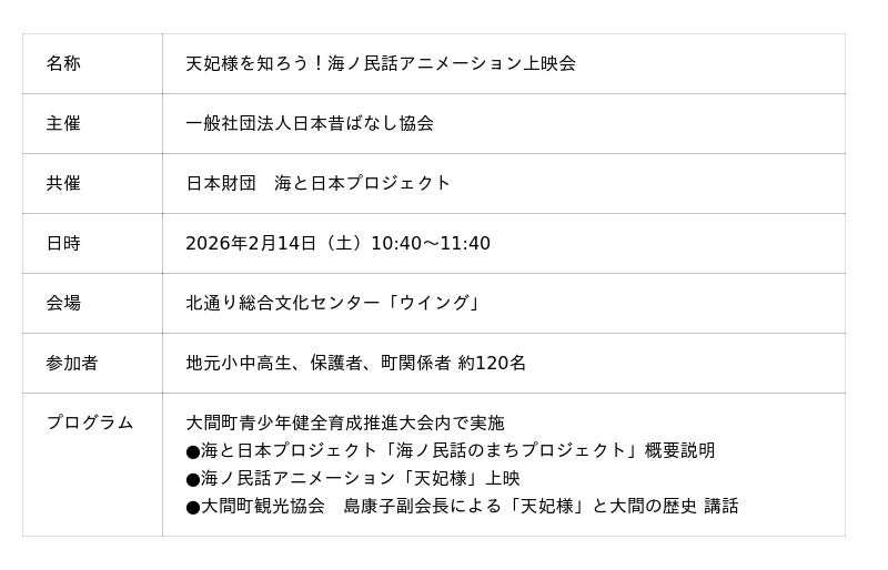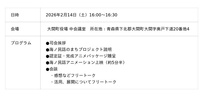一般社団法人日本昔ばなし協会が取り組む「海ノ民話のまちプロジェクト」は、2026年2月14日(土)に青森県大間町を舞台にした海ノ民話アニメーション「天妃様」が完成したため、アニメ監督が大間町を訪問しアニメのお披露目と「海ノ民話のまち」認定式を実施しました。