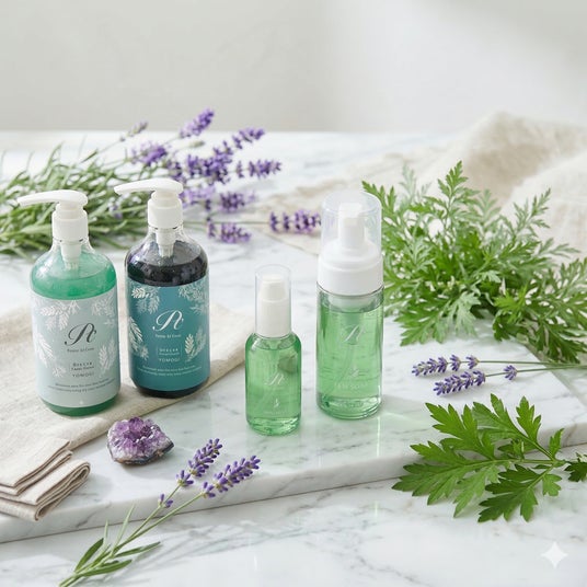 成分を一つ一つ厳選し、ヨモギをはじめとする天然植物エキスを豊富に含んだシャンプーとコンディショナー。