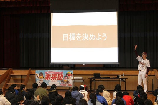 2009年度から野球を通じた地域密着活動として、「夢」や「目標」を持つことの大切さについて、講師の体験談を交えながら小中学生に伝えていく「楽天イーグルス 未来塾」を実施しています。2026年度第一回目の授業として、アンバサダーの岡島 豪郎が講師を務めます。現在、柴田町の仙台大学大学院に在籍しており、学びの拠点である柴田町の子どもたちへ、自身の体験談を交えて熱いメッセージを届けます。